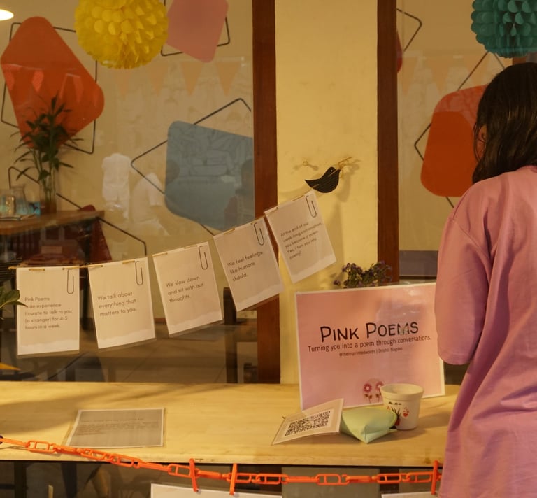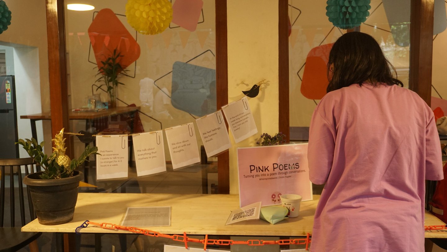 Pink Poems is a self-love project to celebrate 'you' by turning you into poetry. Drishti, the founder, curates online conversational sessions for you, throughout the week, and turns you into a poem by the end. Learn more here.